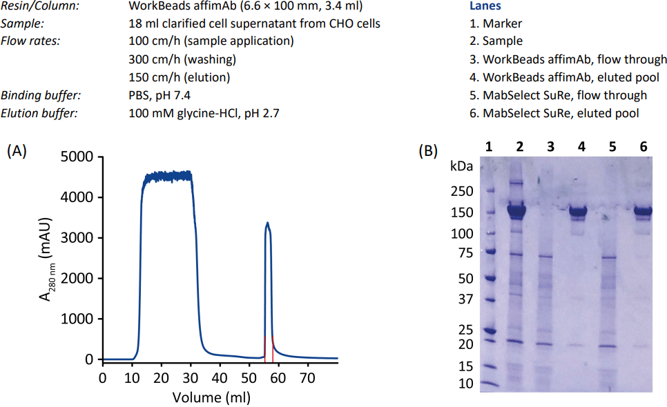 An example of using WorkBeads affimAb for a purification of a monoclonal antibody expressed in CHO cells is shown in Figure 4A. Purity was analyzed by SDS-PAGE, see Figure 4B. A comparison with MabSelect SuRe is included.