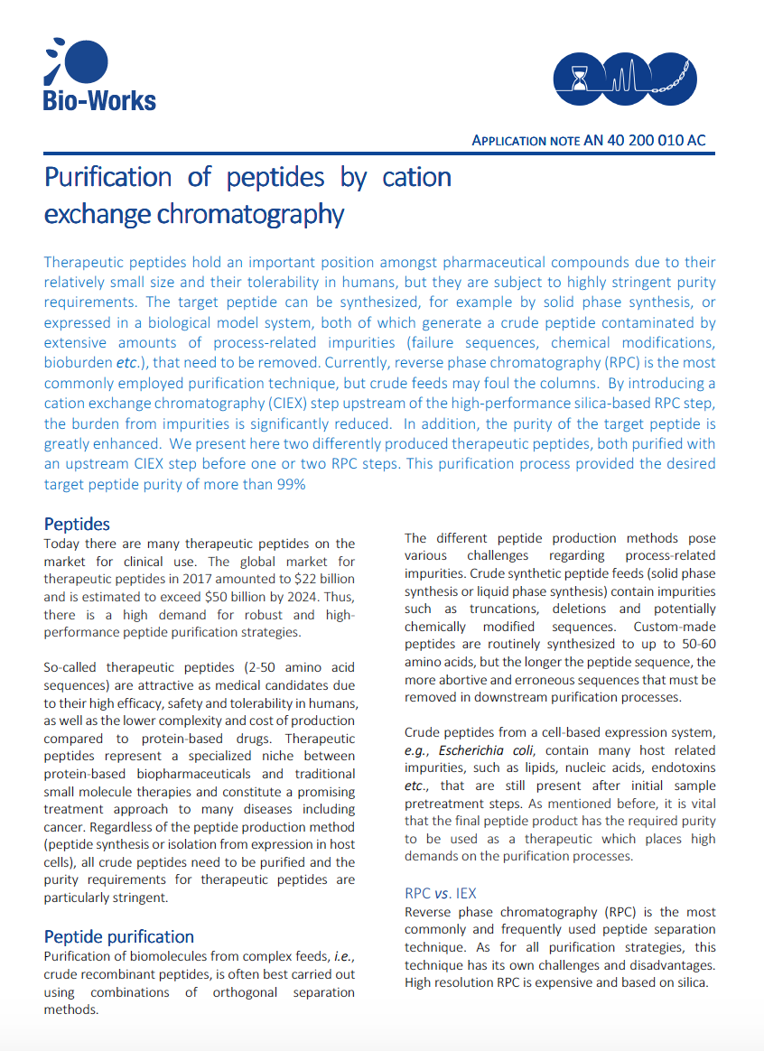 Therapeutic peptides are subject to highly stringent purity requirements. In this Application Note we present two differently produced therapeutic peptides purified using an upstream cation exchange chromatography (CIEX) step before one or two reverse phase chromatography (RPC) steps.